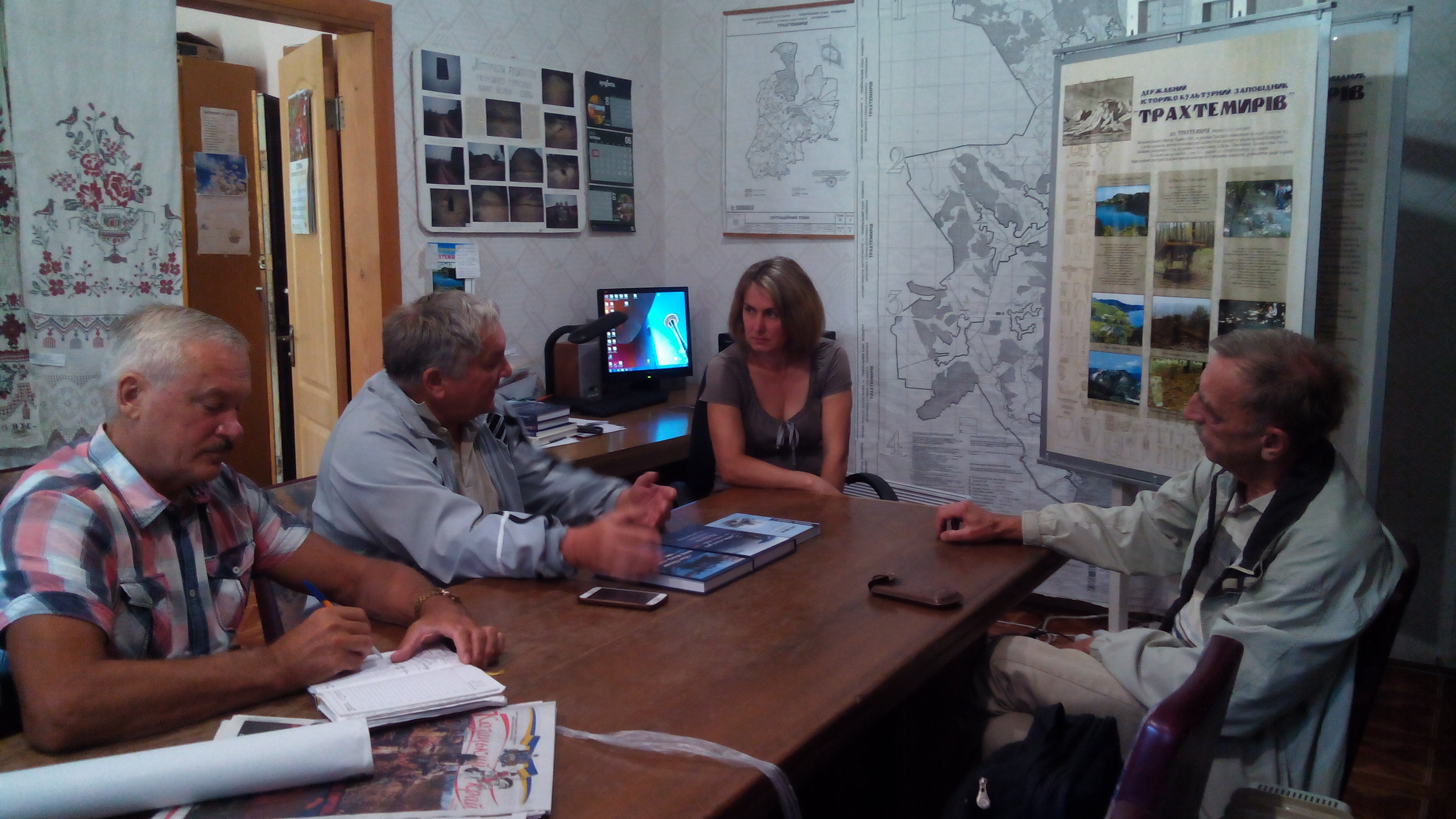 Актив громадської організації «Старий Дніпро» 6 серпня провів своє традиційне щотижневе оперативне засідання в Каневі в офісі Державного історико-культурного заповідника «Трахтемирів». Це викликано тим, що зараз триває активна робота над написанням третьої книги серії «Затоплені села Переяславщини» про колишні населені пункти Трахтемирів і Монастирок, а оскільки їх територією в науково-дослідному плані зараз опікується саме цей заповідник, тож і виникла можливість залучити до збору матеріалів для книги і його науковців.